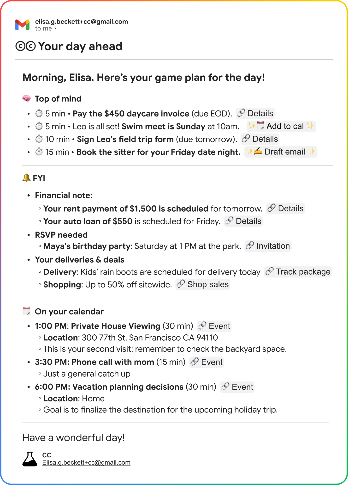 CC is a standalone experimental service provided by Google Labs. Your data in CC, including any feedback you choose to provide, is processed per the Google Privacy Policy. CC is not part of Google Workspace or Gemini Apps. The Workspace Labs Privacy Notice and the Gemini Apps Privacy Notice do not apply.